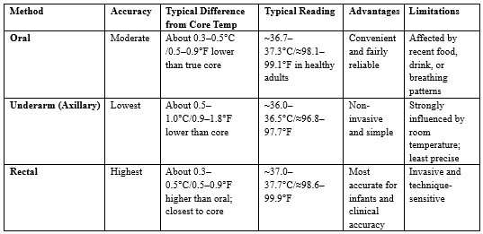 | Method | Accuracy | Typical Difference from Core Temp | Typical Reading | Advantages | Limitations |