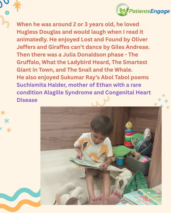 Ethan is not very consistent when it comes to books—he goes through phases. When he was around 2 or 3 years old, he used to love Hugless Douglas and would laugh when I read it in an animated way. He also enjoyed Lost and Found by Oliver Jeffers and Giraffes Can't Dance by Giles Andreae.