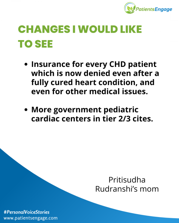 One change I would really like to see in the medical healthcare system, and this is very important, is insurance for every CHD patient which is now denied even after a fully cured heart condition, and even for other medical issues. Secondly, more government setups for pediatric cardiac centers in tier 2/3 cites.