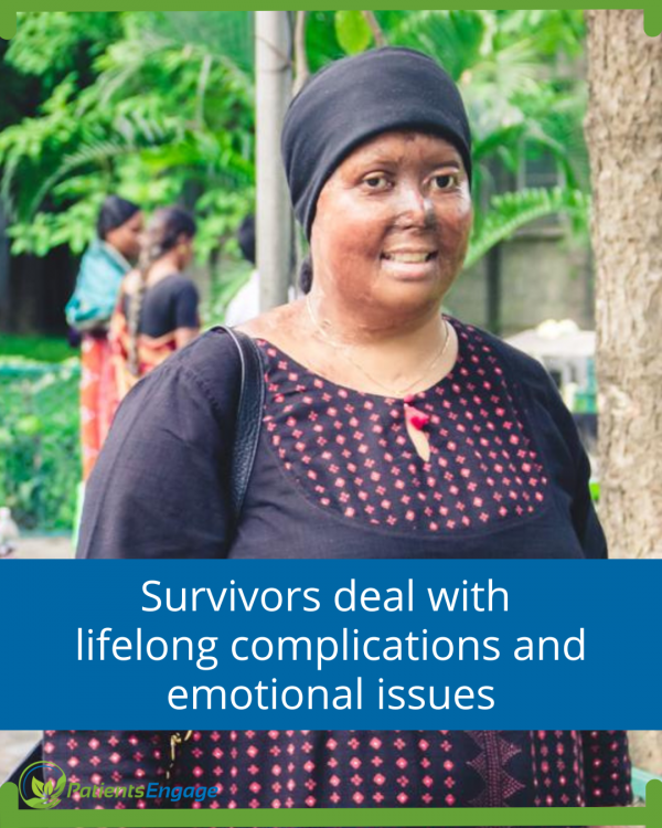 Long-term, survivors face challenges like vision loss, breathing difficulties, loss of hearing or nostril structure, and mobility issues due to contracture. Mentally, PTSD, depression, and social anxiety are common fallouts. Continuous emotional and social support are essential for true recovery and healing.